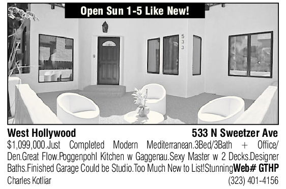 Open Sun 1-5 Like New! West Hollywood 533 N Sweetzer Ave $1,099,000.Just Completed Modern Mediterranean.3Bed/3Bath + Office/ Den.Great Flow.Poggenpohl Kitchen w Gaggenau.Sexy Master w 2 Decks.Designer Baths.Finished Garage Could be Studio.Too Much New to List!StunningWeb# GTHP Charles Kotliar (323) 401-4156
