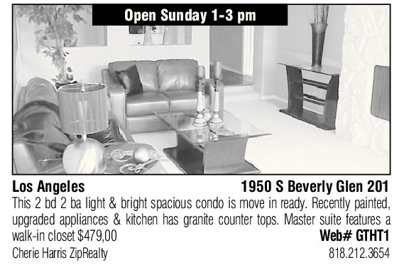 Open Sunday 1-3 pm Los Angeles 1950 S Beverly Glen 201 This 2 bd 2 ba light & bright spacious condo is move in ready. Recently painted, upgraded appliances & kitchen has granite counter tops. Master suite features a walk-in closet $479,00 Web# GTHT1 Cherie Harris ZipRealty 818.212.3654