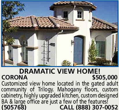 DRAMATIC VIEW HOME! CORONA $505,000 Customized view home located in the gated adult community of Trilogy. Mahogany floors, custom cabinetry, highly upgraded kitchen, custom designed BA & large office are just a few of the features! (505768) CALL (888) 307-0052