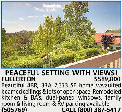 (505707) CALL (800) 679-5678 PEACEFUL SETTING WITH VIEWS! FULLERTON $589,000 Beautiful 4BR, 3BA 2,373 SF home w/vaulted beamed ceilings & lots of open space. Remodeled kitchen & BA’s, dual-paned windows, family room & living room & RV parking available. (505769) CALL (800) 387-5417