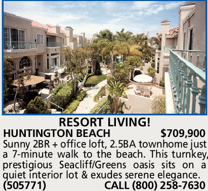 HUNTINGTON BEACH $709,900 Sunny 2BR + office loft, 2.5BA townhome just a 7-minute walk to the beach. This turnkey, prestigious Seacliff/Greens oasis sits on a quiet interior lot & exudes serene elegance. (505771) CALL (800) 258-7630