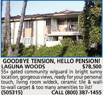 GOODBYE TENSION, HELLO PENSION! LAGUNA WOODS $78,500 55+ gated community w/guard in bright sunny location, gorgeous views, ready for your personal touch, living room w/deck, ceramic tile & wallto-wall carpet & too many amenities to list! (505315) CALL (800) 387-1455