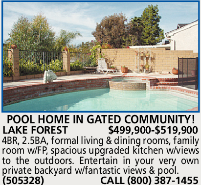 POOL HOME IN GATED COMMUNITY! LAKE FOREST $499,900-$519,900 4BR, 2.5BA, formal living & dining rooms, family room w/FP, spacious upgraded kitchen w/views to the outdoors. Entertain in your very own private backyard w/fantastic views & pool. (505328) CALL (800) 387-1455