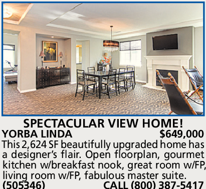 YORBA LINDA $649,000 This 2,624 SF beautifully upgraded home has a designer’s flair. Open floorplan, gourmet kitchen w/breakfast nook, great room w/FP, living room w/FP, fabulous master suite. (505346) CALL (800) 387-5417