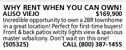 WHY RENT WHEN YOU CAN OWN! ALISO VIEJO $169,900 Incredible opportunity to own a 2BR townhome in a great location! Perfect for first-time buyers! Front & back patios w/city lights view & spacious master w/balcony. Don’t wait on this one! (505325) CALL (800) 387-1455