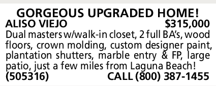 GORGEOUS UPGRADED HOME! ALISO VIEJO $315,000 Dual masters w/walk-in closet, 2 full BA’s, wood floors, crown molding, custom designer paint, plantation shutters, marble entry & FP, large patio, just a few miles from Laguna Beach! (505316) CALL (800) 387-1455