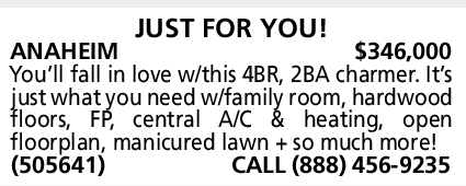ANAHEIM $346,000 You’ll fall in love w/this 4BR, 2BA charmer. It’s just what you need w/family room, hardwood floors, FP, central A/C & heating, open floorplan, manicured lawn + so much more!
