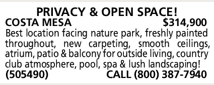 COSTA MESA $314,900 Best location facing nature park, freshly painted throughout, new carpeting, smooth ceilings, atrium, patio & balcony for outside living, country club atmosphere, pool, spa & lush landscaping! (505490) CALL (800) 387-7940