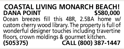 COASTAL LIVING MONARCH BEACH! DANA POINT $580,000 Ocean breezes fill this 4BR, 2.5BA home w/ custom cherry wood library. The property is full of wonderful designer touches including travertine floors, crown moldings & gourmet kitchen. (505375) CALL (800) 387-1447