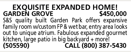 EXQUISITE EXPANDED HOME! GARDEN GROVE $450,000 S&S quality built Garden Park offers expansive family room w/custom FP & wet bar, entry area looks out to unique atrium. Fabulous expanded gourmet kitchen, large patio in big backyard + more! (505590) CALL (800) 387-5430