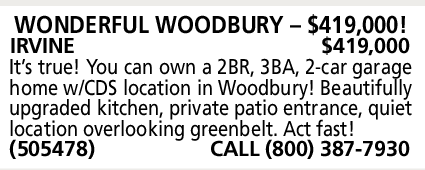 WONDERFUL WOODBURY – $419,000! IRVINE $419,000 It’s true! You can own a 2BR, 3BA, 2-car garage home w/CDS location in Woodbury! Beautifully upgraded kitchen, private patio entrance, quiet location overlooking greenbelt. Act fast! (505478) CALL (800) 387-7930