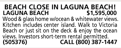BEACH CLOSE IN LAGUNA BEACH! LAGUNA BEACH $1,595,000 Wood & glass home w/ocean & whitewater views. Kitchen includes center island. Walk to Victoria Beach or just sit on the deck & enjoy the ocean views. Investors short-term rental permitted. (505376) CALL (800) 387-1447