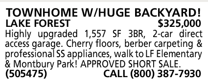 TOWNHOME W/HUGE BACKYARD! LAKE FOREST $325,000 Highly upgraded 1,557 SF 3BR, 2-car direct access garage. Cherry floors, berber carpeting & professional SS appliances, walk to LF Elementary & Montbury Park! APPROVED SHORT SALE. (505475) CALL (800) 387-7930 GREAT PRICE FOR NEW BUYER!