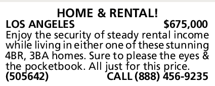 HOME & RENTAL! LOS ANGELES $675,000 Enjoy the security of steady rental income while living in either one of these stunning 4BR, 3BA homes. Sure to please the eyes & the pocketbook. All just for this price. (505642) CALL (888) 456-9235 ATTENTION CAR BUFFS