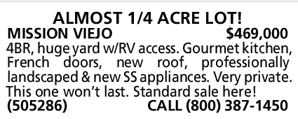 ALMOST 1/4 ACRE LOT! MISSION VIEJO $469,000 4BR, huge yard w/RV access. Gourmet kitchen, French doors, new roof, professionally landscaped & new SS appliances. Very private. This one won’t last. Standard sale here! (505286) CALL (800) 387-1450 BEST PRICE IN TOWN & UPGRADED!