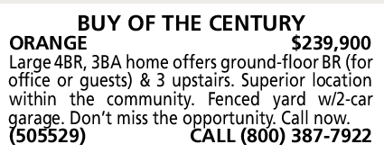 BUY OF THE CENTURY ORANGE $239,900 Large 4BR, 3BA home offers ground-floor BR (for office or guests) & 3 upstairs. Superior location within the community. Fenced yard w/2-car garage. Don’t miss the opportunity. Call now. (505529) CALL (800) 387-7922 PANORAMIC VIEW LOCATION!