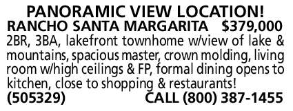 PANORAMIC VIEW LOCATION! RANCHO SANTA MARGARITA $379,000 2BR, 3BA, lakefront townhome w/view of lake & mountains, spacious master, crown molding, living room w/high ceilings & FP, formal dining opens to kitchen, close to shopping & restaurants! (505329) CALL (800) 387-1455 CLOSE TO PARK $285,000!