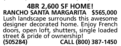 RANCHO SANTA MARGARITA $565,000 Lush landscape surrounds this awesome designer decorated home. Enjoy French doors, open loft, shutters, single loaded street & pride of ownership! (505284) CALL (800) 387-1450