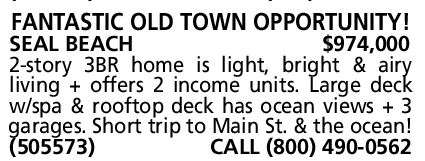 FANTASTIC OLD TOWN OPPORTUNITY! SEAL BEACH $974,000 2-story 3BR home is light, bright & airy living + offers 2 income units. Large deck w/spa & rooftop deck has ocean views + 3 garages. Short trip to Main St. & the ocean! (505573) CALL (800) 490-0562