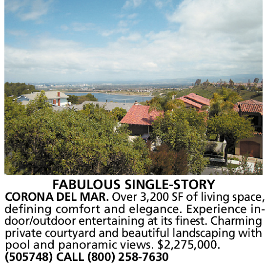 FABULOUS SINGLE-STORY CORONA DEL MAR. Over 3,200 SF of living space, defining comfort and elegance. Experience indoor/outdoor entertaining at its finest. Charming private courtyard and beautiful landscaping with pool and panoramic views. $2,275,000. (505748) CALL (800) 258-7630