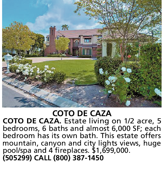 COTO DE CAZA COTO DE CAZA. Estate living on 1/2 acre, 5 bedrooms, 6 baths and almost 6,000 SF; each bedroom has its own bath. This estate offers mountain, canyon and city lights views, huge pool/spa and 4 fireplaces. $1,699,000. (505299) CALL (800) 387-1450