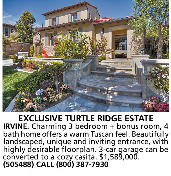 EXCLUSIVE TURTLE RIDGE ESTATE IRVINE. Charming 3 bedroom + bonus room, 4 bath home offers a warm Tuscan feel. Beautifully landscaped, unique and inviting entrance, with highly desirable floorplan. 3-car garage can be converted to a cozy casita. $1,589,000. (505488) CALL (800) 387-7930