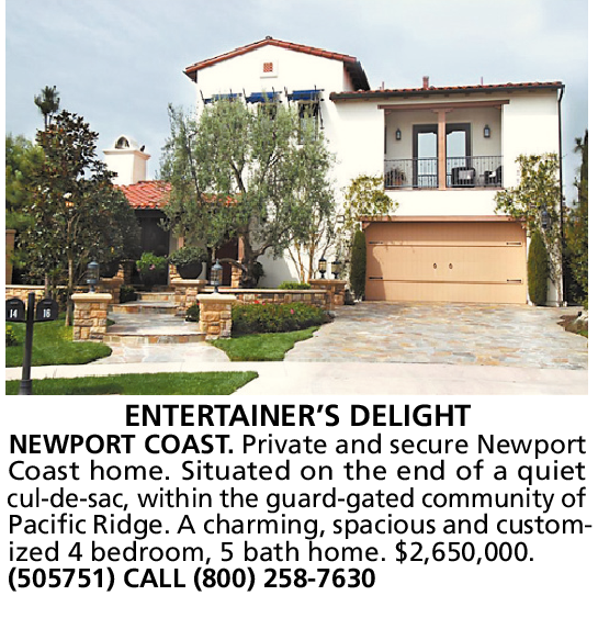ENTERTAINER’S DELIGHT NEWPORT COAST. Private and secure Newport Coast home. Situated on the end of a quiet cul-de-sac, within the guard-gated community of Pacific Ridge. A charming, spacious and customized 4 bedroom, 5 bath home. $2,650,000. (505751) CALL (800) 258-7630