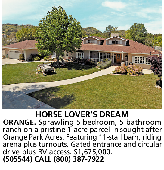 HORSE LOVER’S DREAM ORANGE. Sprawling 5 bedroom, 5 bathroom ranch on a pristine 1-acre parcel in sought after Orange Park Acres. Featuring 11-stall barn, riding arena plus turnouts. Gated entrance and circular drive plus RV access. $1,675,000. (505544) CALL (800) 387-7922