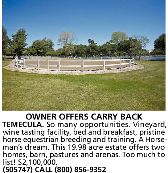 OWNER OFFERS CARRY BACK TEMECULA. So many opportunities. Vineyard, wine tasting facility, bed and breakfast, pristine horse equestrian breeding and training. A Horseman’s dream. This 19.98 acre estate offers two homes, barn, pastures and arenas. Too much to list! $2,100,000. (505747) CALL (800) 856-9352