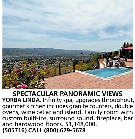 SPECTACULAR PANORAMIC VIEWS YORBA LINDA. Infinity spa, upgrades throughout, gourmet kitchen includes granite counters, double ovens, wine cellar and island. Family room with custom built-ins, surround sound, fireplace, bar and hardwood floors. $1,148,000.