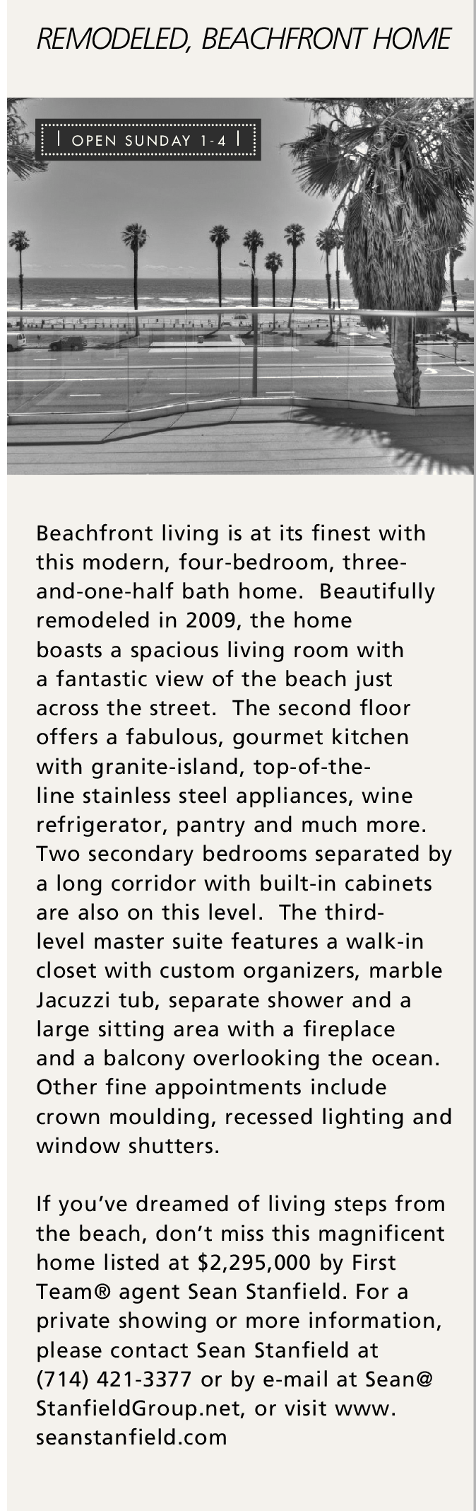 If you’ve dreamed of living steps from the beach, don’t miss this magnificent home listed at $2,295,000 by First Team® agent Sean Stanfield. For a private showing or more information, please contact Sean Stanfield at (714) 421-3377 or by e-mail at Sean@ StanfieldGroup.net, or visit www. seanstanfield.com