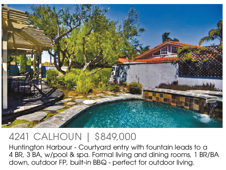 4241 CALHOUN | $849,000 Huntington Harbour - Courtyard entry with fountain leads to a 4 BR, 3 BA, w/pool & spa. Formal living and dining rooms, 1 BR/BA down, outdoor FP, built-in BBQ - perfect for outdoor living.