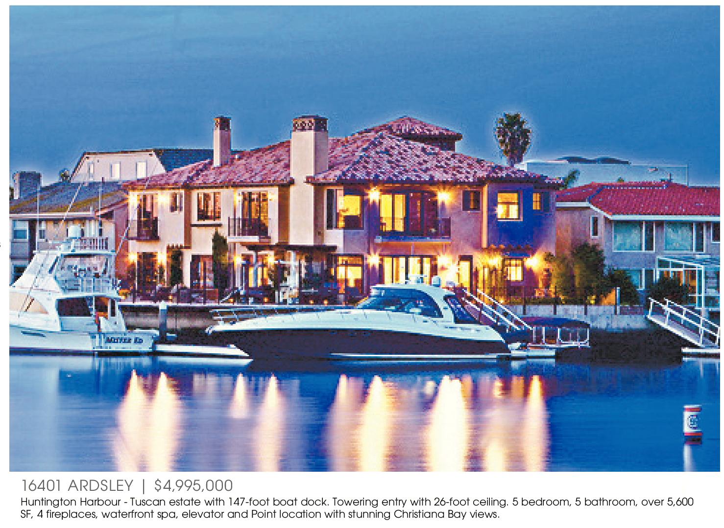 chef’s 16401 ARDSLEY | $4,995,000 Huntington Harbour - Tuscan estate with 147-foot boat dock. Towering entry with 26-foot ceiling. 5 bedroom, 5 bathroom, over 5,600 SF, 4 fireplaces, waterfront spa, elevator and Point location with stunning Christiana Bay views.