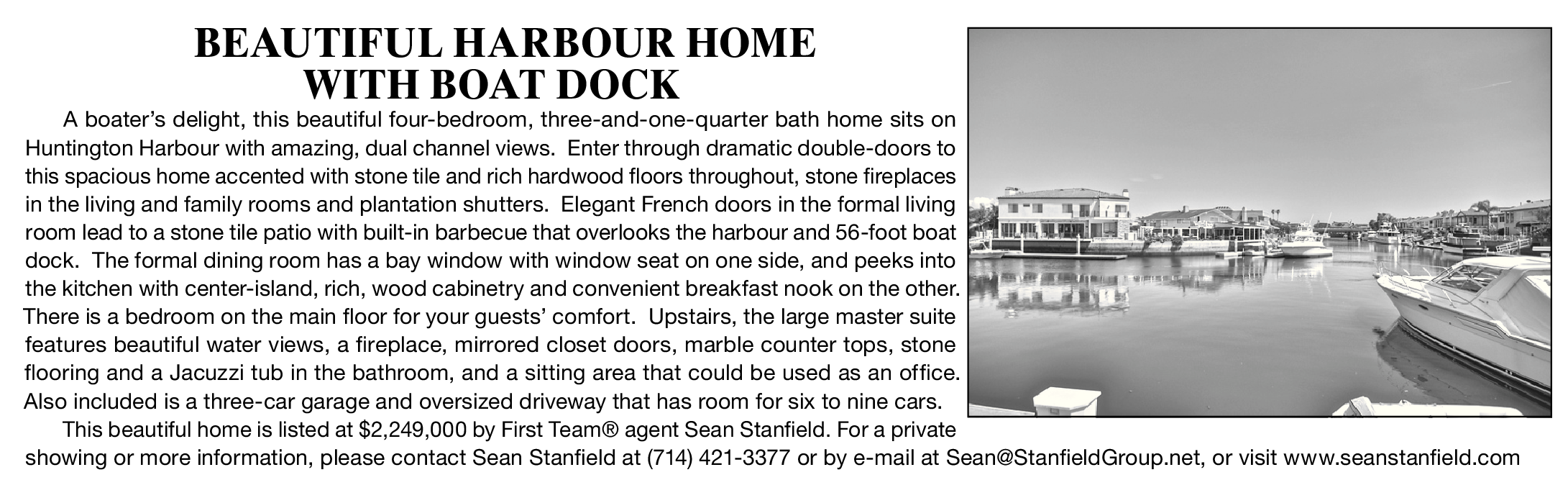 A boater’s delight, this beautiful four-bedroom, three-and-one-quarter bath home sits on Huntington Harbour with amazing, dual channel views. Enter through dramatic double-doors to this spacious home accented with stone tile and rich hardwood floors throughout, stone fi replaces in the living and family rooms and plantation shutters. Elegant French doors in the formal living room lead to a stone tile patio with built-in barbecue that overlooks the harbour and 56-foot boat dock. The formal dining room has a bay window with window seat on one side, and peeks into the kitchen with center-island, rich, wood cabinetry and convenient breakfast nook on the other.