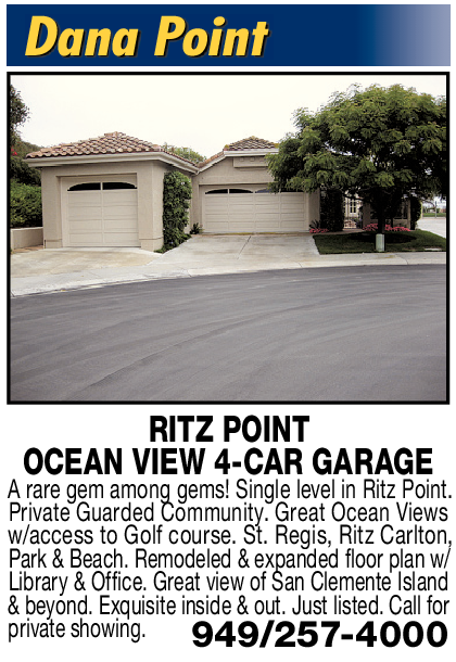 RITZ POINT OCEAN VIEW 4-CAR GARAGE A rare gem among gems! Single level in Ritz Point. Private Guarded Community. Great Ocean Views w/access to Golf course. St. Regis, Ritz Carlton, Park & Beach. Remodeled & expanded floor plan w/ Library & Office. Great view of San Clemente Island & beyond. Exquisite inside & out. Just listed. Call for private showing. 949/257-4000