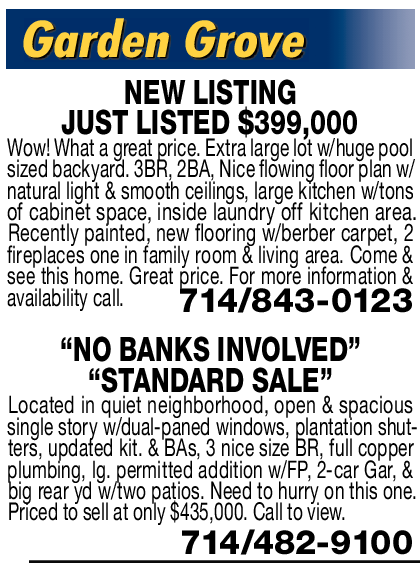 NEW LISTING JUST LISTED $399,000 Wow! What a great price. Extra large lot w/huge pool sized backyard. 3BR, 2BA, Nice flowing floor plan w/ natural light & smooth ceilings, large kitchen w/tons of cabinet space, inside laundry off kitchen area. Recently painted, new flooring w/berber carpet, 2 fireplaces one in family room & living area. Come & see this home. Great price. For more information & availability call. 714/843-0123
