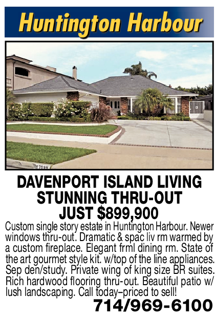 DAVENPORT ISLAND LIVING STUNNING THRU-OUT JUST $899,900 Custom single story estate in Huntington Harbour. Newer windows thru-out. Dramatic & spac liv rm warmed by a custom fireplace. Elegant frml dining rm. State of the art gourmet style kit. w/top of the line appliances. Sep den/study. Private wing of king size BR suites. Rich hardwood flooring thru-out. Beautiful patio w/ lush landscaping. Call today–priced to sell!