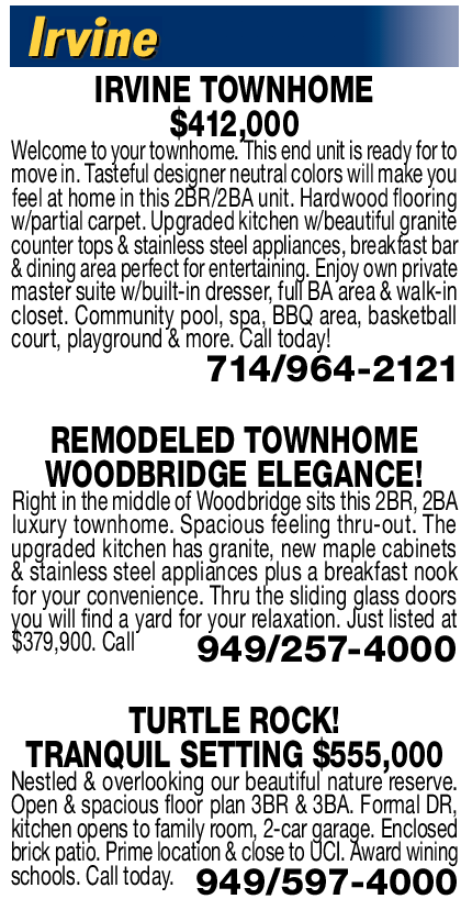 Irvine IRVINE TOWNHOME $412,000 Welcome to your townhome. This end unit is ready for to move in. Tasteful designer neutral colors will make you feel at home in this 2BR/2BA unit. Hardwood flooring w/partial carpet. Upgraded kitchen w/beautiful granite counter tops & stainless steel appliances, breakfast bar & dining area perfect for entertaining. Enjoy own private master suite w/built-in dresser, full BA area & walk-in closet. Community pool, spa, BBQ area, basketball court, playground & more. Call today! 714/964-2121 REMODELED TOWNHOME WOODBRIDGE ELEGANCE! Right in the middle of Woodbridge sits this 2BR, 2BA luxury townhome. Spacious feeling thru-out. The upgraded kitchen has granite, new maple cabinets & stainless steel appliances plus a breakfast nook for your convenience. Thru the sliding glass doors you will find a yard for your relaxation. Just listed at $379,900. Call 949/257-4000 TURTLE ROCK! TRANQUIL SETTING $555,000 Nestled & overlooking our beautiful nature reserve. Open & spacious floor plan 3BR & 3BA. Formal DR, kitchen opens to family room, 2-car garage. Enclosed brick patio. Prime location & close to UCI. Award wining schools. Call today. 949/597-4000