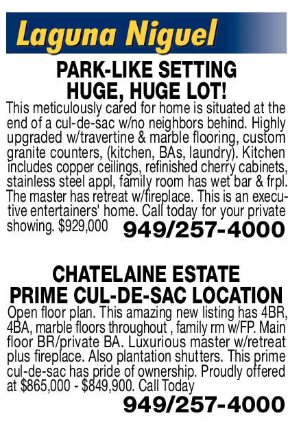 Laguna Niguel PARK-LIKE SETTING HUGE, HUGE LOT! This meticulously cared for home is situated at the end of a cul-de-sac w/no neighbors behind. Highly upgraded w/travertine & marble flooring, custom granite counters, (kitchen, BAs, laundry). Kitchen includes copper ceilings, refinished cherry cabinets, stainless steel appl, family room has wet bar & frpl. The master has retreat w/fireplace. This is an executive entertainers' home. Call today for your private showing. $929,000 949/257-4000 CHATELAINE ESTATE PRIME CUL-DE-SAC LOCATION Open floor plan. This amazing new listing has 4BR, 4BA, marble floors throughout , family rm w/FP. Main floor BR/private BA. Luxurious master w/retreat plus fireplace. Also plantation shutters. This prime cul-de-sac has pride of ownership. Proudly offered at $865,000 - $849,900. Call Today 949/257-4000