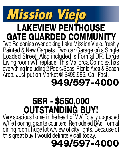 LAKEVIEW PENTHOUSE GATE GUARDED COMMUNITY Two Balconies overlooking Lake Mission Viejo, freshly Painted & New Carpets. Two car Garage on a Single Loaded Street. Also included is Formal DR, Large Living room w/Fireplace. This Mallorca Complex has everything including 2 Pools/Spas. Picnic Area & Beach Area. Just put on Market @ $499,999. Call Fast.