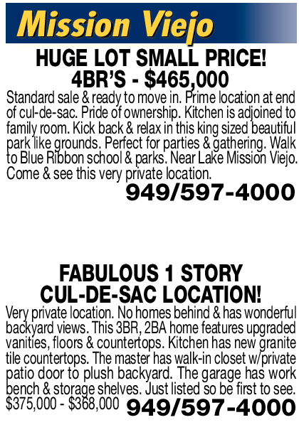 4BR’S - $465,000 Standard sale & ready to move in. Prime location at end of cul-de-sac. Pride of ownership. Kitchen is adjoined to BR’s. family room. Kick back & relax in this king sized beautiful park like grounds. Perfect for parties & gathering. Walk to Blue Ribbon school & parks. Near Lake Mission Viejo. Come & see this very private location. 949/597-4000