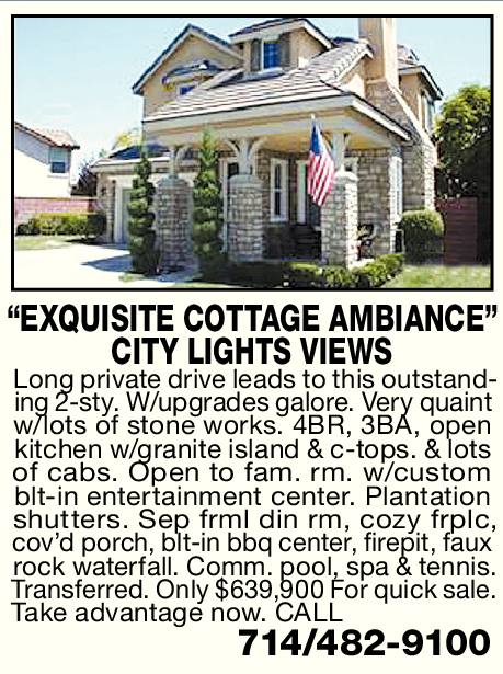 “EXQUISITE COTTAGE AMBIANCE” CITY LIGHTS VIEWS Long private drive leads to this outstanding 2-sty. W/upgrades galore. Very quaint w/lots of stone works. 4BR, 3BA, open kitchen w/granite island & c-tops. & lots of cabs. Open to fam. rm. w/custom blt-in entertainment center. Plantation shutters. Sep frml din rm, cozy frplc, cov’d porch, blt-in bbq center, firepit, faux rock waterfall. Comm. pool, spa & tennis.