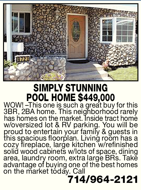 SIMPLY STUNNING POOL HOME $449,000 WOW! –This one is such a great buy for this 3BR, 2BA home. This neighborhood rarely has homes on the market. Inside tract home w/oversized lot & RV parking. You will be proud to entertain your family & guests in this spacious floorplan. Living room has a cozy fireplace, large kitchen w/refinished solid wood cabinets w/lots of space, dining area, laundry room, extra large BRs. Take advantage of buying one of the best homes on the market today. Call 714/964-2121