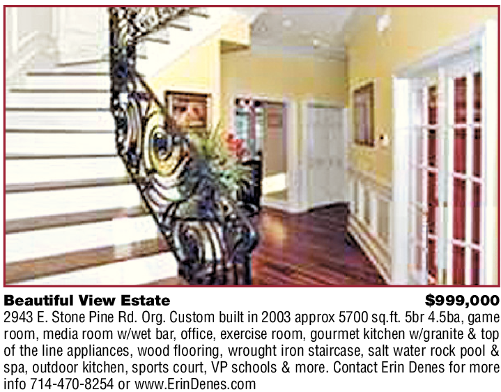 Beautiful View Estate $999,000 2943 E. Stone Pine Rd. Org. Custom built in 2003 approx 5700 sq.ft. 5br 4.5ba, game room, media room w/wet bar, office, exercise room, gourmet kitchen w/granite & top of the line appliances, wood flooring, wrought iron staircase, salt water rock pool & spa, outdoor kitchen, sports court, VP schools & more. Contact Erin Denes for more info 714-470-8254 or www.ErinDenes.com