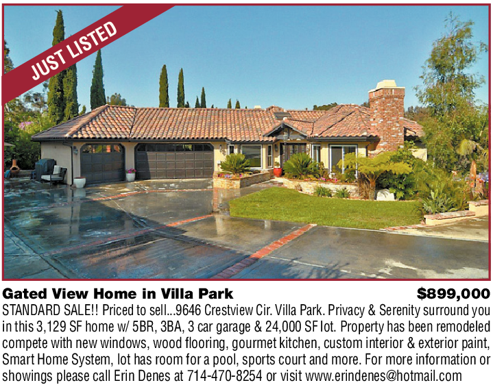 Gated View Home in Villa Park $899,000 STANDARD SALE!! Priced to sell...9646 Crestview Cir. Villa Park. Privacy & Serenity surround you in this 3,129 SF home w/ 5BR, 3BA, 3 car garage & 24,000 SF lot. Property has been remodeled compete with new windows, wood flooring, gourmet kitchen, custom interior & exterior paint, Smart Home System, lot has room for a pool, sports court and more. For more information or showings please call Erin Denes at 714-470-8254 or visit www.erindenes@hotmail.com