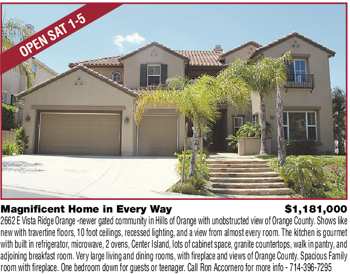Magnificent Home in Every Way $1,181,000 2662 E Vista Ridge Orange -newer gated community in Hills of Orange with unobstructed view of Orange County. Shows like new with travertine floors, 10 foot ceilings, recessed lighting, and a view from almost every room. The kitchen is gourmet with built in refrigerator, microwave, 2 ovens, Center Island, lots of cabinet space, granite countertops, walk in pantry, and adjoining breakfast room. Very large living and dining rooms, with fireplace and views of Orange County. Spacious Family room with fi replace. One bedroom down for guests or teenager. Call Ron Accornero for more info - 714-396-7295