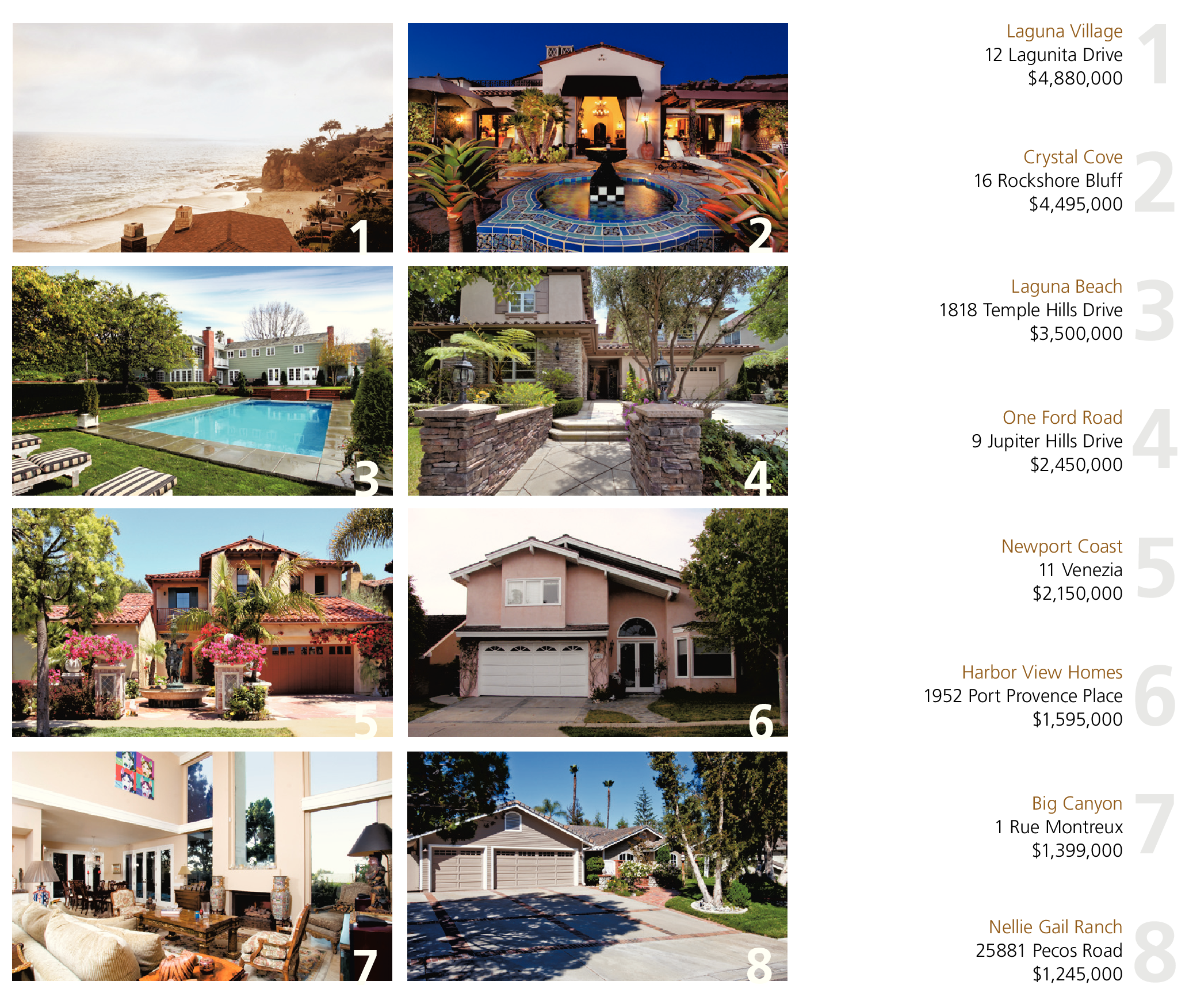 1 3 5 7 2 4 6 8 Laguna Village 12 Lagunita Drive $4,880,000 Crystal Cove 16 Rockshore Bluff $4,495,000 Laguna Beach 1818 Temple Hills Drive $3,500,000 One Ford Road 9 Jupiter Hills Drive $2,450,000 Newport Coast 11 Venezia $2,150,000 Harbor View Homes 1952 Port Provence Place $1,595,000 Big Canyon 1 Rue Montreux $1,399,000 Nellie Gail Ranch 25881 Pecos Road $1,245,000 1 2 3 4 5 6 7 8
