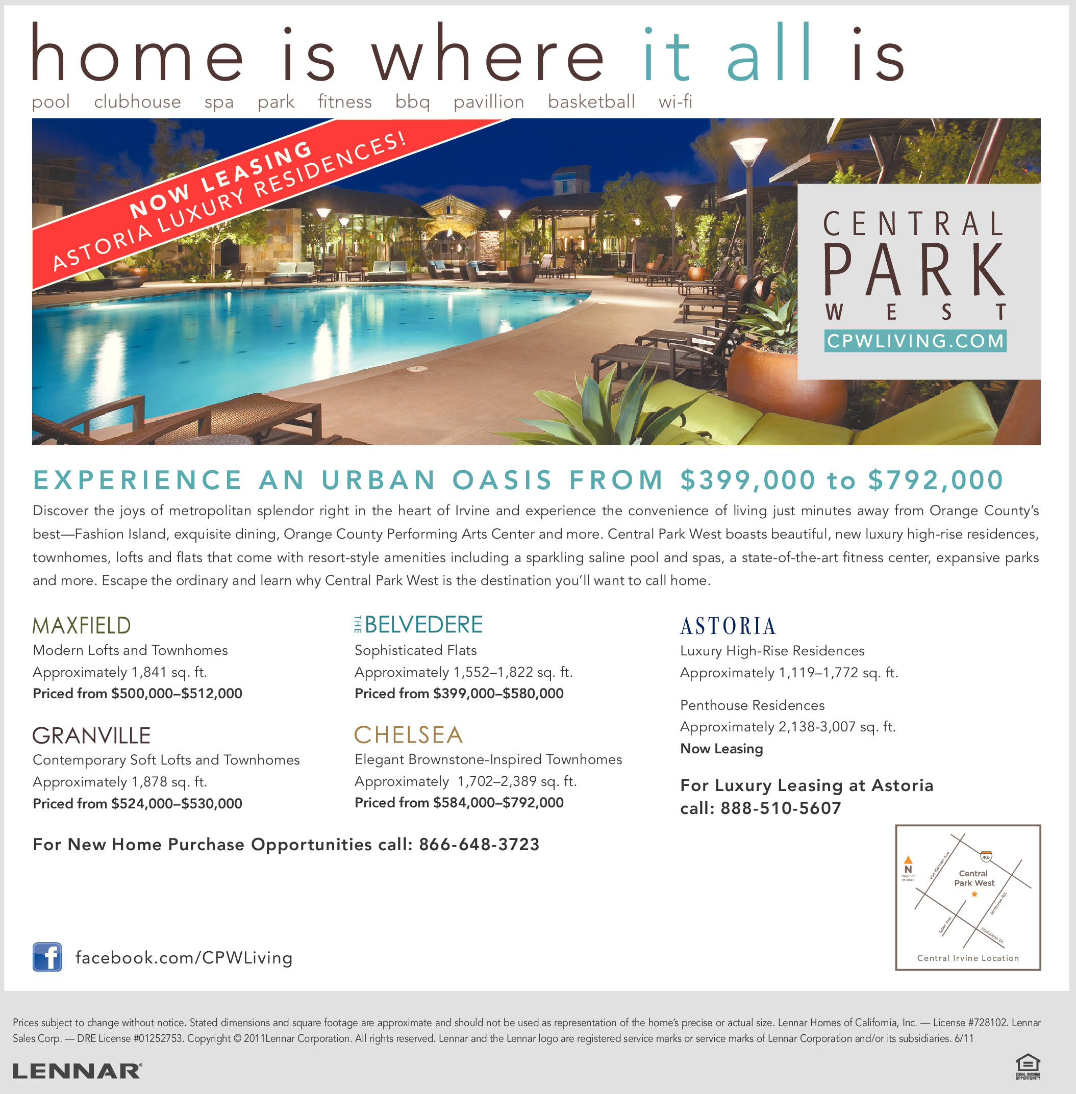 Discover the joys of metropolitan splendor right in the heart of Irvine and experience the convenience of living just minutes away from Orange County’s best—Fashion Island, exquisite dining, Orange County Performing Arts Center and more. Central Park West boasts beautiful, new luxury high-rise residences, townhomes, lofts and flats that come with resort-style amenities including a sparkling saline pool and spas, a state-of-the-art fitness center, expansive parks and more. Escape the ordinary and learn why Central Park West is the destination you’ll want to call home.