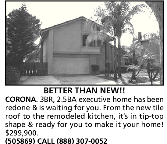CORONA. 3BR, 2.5BA executive home has been redone & is waiting for you. From the new tile roof to the remodeled kitchen, it’s in tip-top shape & ready for you to make it your home! $299,900. (505869) CALL (888) 307-0052