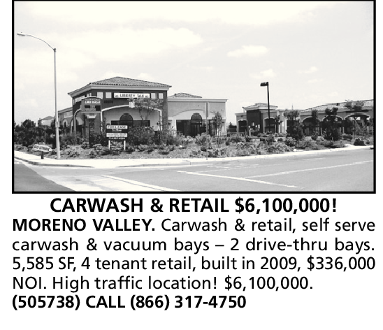 MORENO VALLEY. Carwash & retail, self serve carwash & vacuum bays – 2 drive-thru bays. 5,585 SF, 4 tenant retail, built in 2009, $336,000 NOI. High traffic location! $6,100,000. (505738) CALL (866) 317-4750